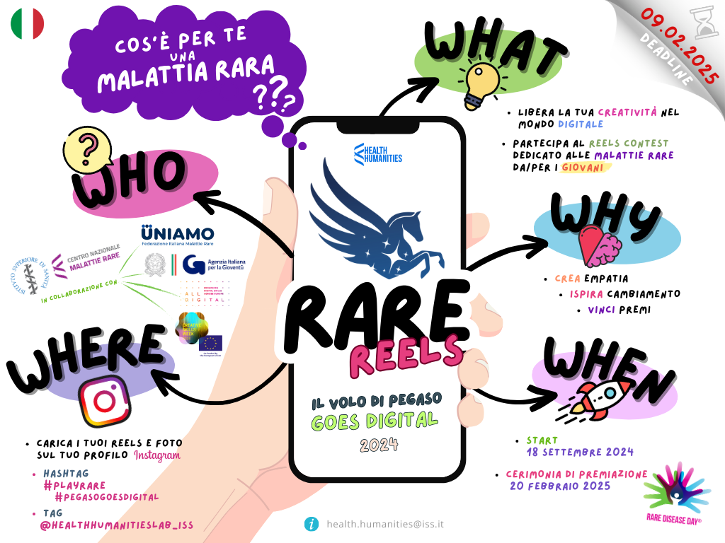 Cos’è per te una malattia rara? C’è tempo fino al prossimo 9 febbraio per rispondere a questa domanda su Instagram attraverso video brevi e coinvolgenti (15-30 secondi) e partecipare così a "RARE REELS: Pegaso goes digital!", il concorso promosso dall’Istituto Superiore di Sanità, attraverso il Laboratorio di Health Humanities del Centro Nazionale Malattie Rare, UNIAMO Federazione Italiana Malattie Rare, Agenzia Italiana per la Gioventù, All Digital e il network della Creative Skills Week.
