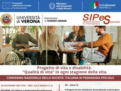28 novembre 2025 - 29 novembre 2025 Università di Verona - Viale Università, 4 - Polo ZanottoProgetto di vita e disabilità. “Qualità di vita” in ogni stagione della vitaIl diritto delle persone con disabilità al progetto di vita individuale, personalizzato e partecipato, insieme ai rischi e alle opportunità: questo il tema al centro del convegno nazionale della Società Italiana di Pedagogia Speciale |
