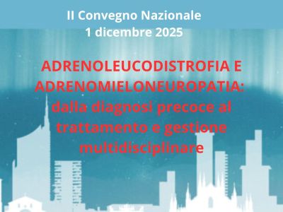 1 dicembre 2025 Starhotels Ritz Via Lazzaro Spallanzani 40, MilanoAdrenoleucodistrofia e Adrenomieloneuropatia: dalla diagnosi precoce al trattamento e gestione multidisciplinareScopo del Convegno è fornire una panoramica esaustiva sugli aspetti diagnostici, terapeutici, nutrizionali e di ricerca di questa patologia che coinvolge specialisti dell’età pediatrica e dell’età adulta, nazionali e internazionali appartenenti alle diverse discipline che ruotano intorno alle numerose problematiche della malattia |
