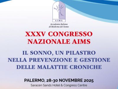 28 novembre 2025 - 30 novembre 2025 Saracen Sands Hotel & Congress Centre (Palermo)XXXV Congresso Nazionale sul sonno AIMS - Il sonno pilastro nella prevenzione e gestione delle malattie cronicheAppuntamento annuale per un aggiornamento sui nuovi sviluppi in ambito scientifico e tecnologico sul sonno e sui suoi disturbi, nonché occasione di formazione e confronto con i più grandi esperti italiani di medicina del sonno |