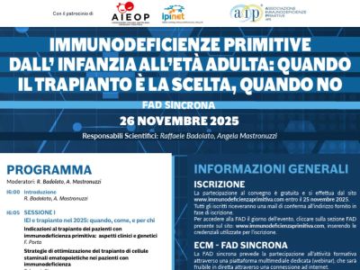 26 novembre 2025 onlineImmunodeficienze primitive. Dall’infanzia all’età adulta: quando il trapianto è la scelta, quando noImmunodeficienze primitive e trapianto, casi clinici a confronto, terapie e follow up. Questi i temi al centro della FAD |