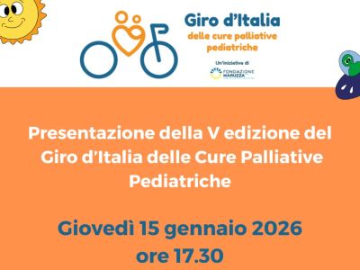 15 gennaio 2026 onlineWebinar di presentazione della V edizione del Giro d’Italia delle Cure Palliative PediatricheDurante il webinar sarà presentato ufficialmente il tema della quinta edizione e le linee guida necessarie per dare vita a eventi e iniziative locali che siano in linea con lo spirito del Giro |