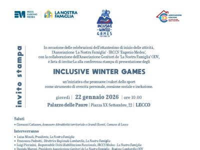 22 gennaio 2026 LeccoInclusive Winter GamesIl progetto, pensato in occasione delle Olimpiadi Invernali Milano-Cortina 2026, nasce con l’obiettivo di favorire l’inclusione sociale, il benessere e la partecipazione attiva dei bambini, con particolare attenzione ai più fragili |