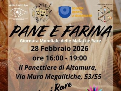 28 febbraio 2026 Altamura - Via delle Mura Megalitiche 53/55PANE E FARINA – Mani RARE in pasta!“Mani RARE in Pasta” è più di un laboratorio: è un’occasione per costruire relazioni, valorizzare l’inclusione e celebrare la diversità come ricchezza, proprio nel giorno dedicato alle malattie rare |
