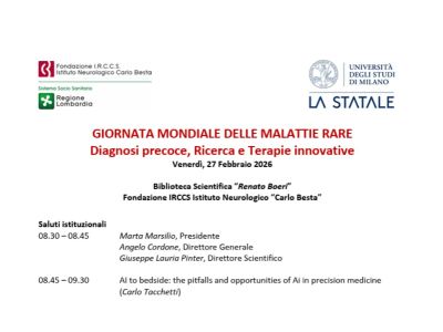 27 febbraio 2026 - 27 febbraio 2026 Milano - Biblioteca Scientifica “Renato Boeri” - Fondazione IRCCS Istituto Neurologico “Carlo Besta” (Via Giovanni Celoria, 11)Diagnosi precoce, Ricerca e Terapie innovativeEvento, organizzato in occasione della Giornata delle malattie rare dalla Fondazione IRCCS Istituto Neurologico “Carlo Besta” |