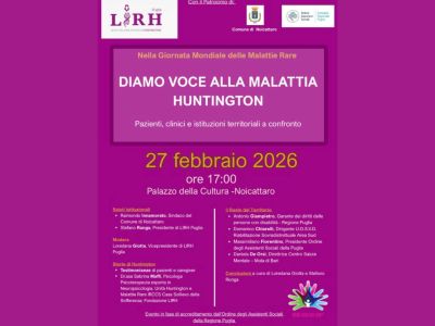 27 febbraio 2026 Palazzo della Cultura (Noicattaro - Bari)Diamo voce alla malattia di HuntingtonIncontro informativo legato alla malattia di Huntington per rafforzare conoscenza e consapevolezza |