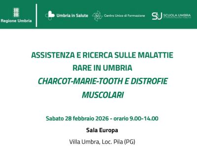 28 febbraio 2026 Sala Europa di Villa Umbra (Perugia)Assistenza e ricerca sulle malattie rare in Umbria - Charcot-Marie-Tooth e distrofie muscolariIl focus del convegno è sui Percorsi Diagnostico Terapeutici Assistenziali (PDTA), fondamentali per garantire una presa in carico esperta e capillare sul territorio |