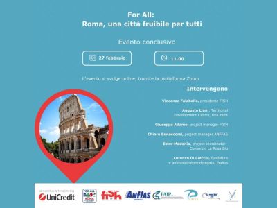 27 febbraio 2026 onlineEvento conclusivo “For All: Roma, città fruibile per tutti”Saranno illustrati i risultati raggiunti e le sfide future per un’accessibilità universale |