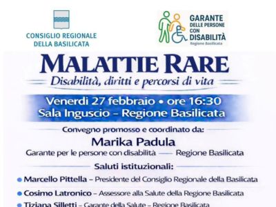 27 febbraio 2026 Sala Inguscio (Regione Basilicata)Malattie Rare – Disabilità, diritti e percorsi di vitaL'incontro, promosso e coordinato da Marika Padula, Garante per le persone con disabilità della Regione Basilicata, è aperto a pazienti, famiglie, operatori sanitari, associazioni e cittadini |
