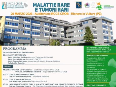 20 marzo 2026 Auditorium IRCCS CROB - Rionero in Vulture (Potenza)Malattie Rare e Tumori RariUna giornata di approfondimento e confronto dedicata a una delle sfide più complesse della sanità contemporanea |