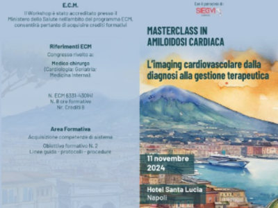 11 novembre 2024 Napoli (Grand Hotel Santa Lucia)Masterclass in amiloidosi cardiaca: l’imaging cardiovascolare dalla diagnosi alla gestione terapeuticaUna Masterclass per presentare lo stato dell’arte e le sfide future dell’imaging multimediale e del management dell’amiloidosi cardiaca |