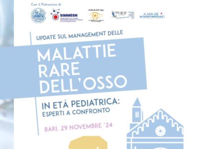 29 novembre 2024 Bari (Ospedale Pediatrico Giovanni XXIII)Up-date sul management delle malattie rare dell’osso in età pediatrica: Esperti a confrontoObiettivo del congresso è garantire a tutti i partecipanti un approfondimento su prevenzione, diagnosi e terapia delle principali patologie rare dell’osso sulla base delle più recenti evidenze scientifiche |
