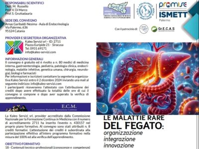 6 dicembre 2024 Catania (Presidio ospedaliero Arnas Garibaldi-Nesima)Le malattie rare del fegato: organizzazione, integrazione, innovazioneIl convegno si propone di creare uno spazio di discussione multidisciplinare per medici, specialisti e pazienti, con l'obiettivo di promuovere la conoscenza della rete regionale e dei Centri Epatologici operativi, nonché favorire e semplificare i percorsi di diagnosi e cura |