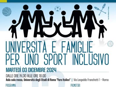 3 dicembre 2024 Roma (Aula Sala Rossa dell’Università "Foro Italico", Via Leopoldo Franchetti 1)Università e famiglie per uno sport inclusivoL'evento intende promuovere lo sport come strumento di inclusione e dialogo |