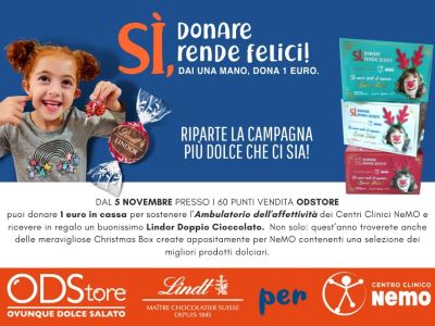 27 novembre 2024 Al via la campagna “Si, donare rende felici” per sostenere i Centri clinici NeMoCambiare la qualità di vita dei bambini con malattia neuromuscolare e delle loro famiglie. È questo l’obiettivo che anche quest’anno si pone la campagna “Si, donare rende felici”, promossa da ODStore, catena di prodotti dolciari e salati |