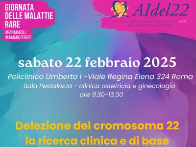 22 febbraio 2025 Roma (Policlinico Umberto I Viale Regina Elena 324, Sala Pestalozza – Clinica Ostetricia e Ginecologia)La ricerca di base e la ricerca clinica sulla delezione del cromosoma 22Verranno illustrati alle famiglie. ma anche a medici e ricercatori, i risultati delle ricerche sulla delezione del cromosoma 22 |