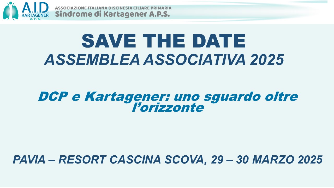 29 marzo 2025 - 30 marzo 2025 PaviaDCP e Kartagener: uno sguardo oltre l’orizzonteNon si tratta solo dell'incontro annuale tra i membri dell'associazione: si parlerà anche di ricerca, stato dell'arte, diagnosi e cure della sindrome di Kartagener |