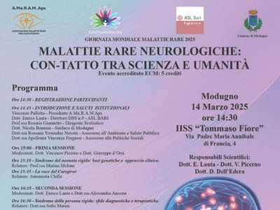 14 marzo 2025 Modugno (Bari) e onlineMalattie rare neurologiche: Con-Tatto tra Scienza e UmanitàIl convegno ha l’obiettivo di illustrare e approfondire le conoscenze attuali riguardo le malattie rare neurologiche, nonché sensibilizzare le istituzioni pubbliche per attivare interventi mirati alla gestione delle problematiche inerenti tali malattie rare |