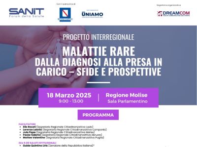 18 marzo 2025 Campobasso (Regione Molise, Sala Parlamentino della Regione Molise, Via Genova, 11)Malattie rare: dalla diagnosi alla presa in carico – sfide e prospettiveIl convegno si propone come momento di confronto interregionale sulla situazione attuale, per evidenziare sfide e best practice e aprire tavoli di lavoro per migliorare la gestione del paziente con malattia rara |