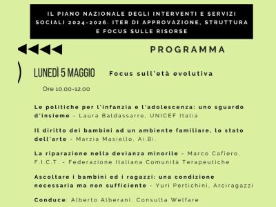 5 maggio 2025 onlineVerso un nuovo sistema di welfareContinuano gli approfondimenti del Forum Terzo Settore sul Piano nazionale degli Interventi e dei Servizi Sociali 2024-2026. Focus sull'età evolutiva |