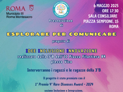 6 maggio 2025 RomaEsplorare per comunicareGli studenti della 3B dell'IC piazza Filattiera 84, plesso Vico, presentano i risultati del progetto "Esplorare per comunicare" |
