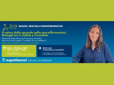 18 maggio 2025 online e in presenza a PadovaIl valore dello sguardo nella neurofibromatosi. Dialoghi tra il visibile e l’invisibileL’esperta, la Dott.ssa Francesca Cavalieri, esplorerà il significato profondo dello sguardo nella neurofibromatosi, tra dimensione individuale e relazionale |