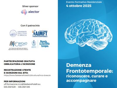 4 ottobre 2025 Brescia – Centro Paolo VI (Via G. Galini 30)Demenza Frontotemporale: riconoscere, curare e accompagnareMeno conosciuta dell’Alzheimer, la demenza frontotemporale è una malattia neurodegenerativa ad esordio precoce, caratterizzata da cambiamenti comportamentali, disturbi del linguaggio e gravi ripercussioni sul piano delle relazioni sociali |