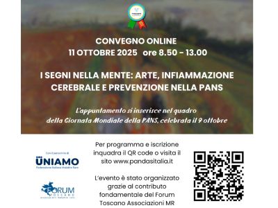 11 ottobre 2025 onlineConvegno online "I segni nella mente: Arte, Infiammazione cerebrale e prevenzione nella PANS"Il convegno esplora la PANS da una prospettiva multidisciplinare, un viaggio tra scienza e creatività, per offrire nuove chiavi di lettura e di intervento a medici, operatori sanitari, educatori e famiglie |