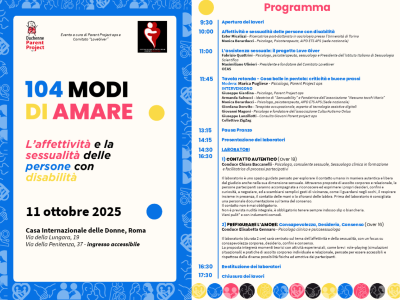 11 ottobre 2025 Roma104 modi di amare. La sessualità e l’affettività delle persone con disabilitàInsieme a esperti, attivisti, e professionisti, si parlerà di come riconoscere e sostenere il diritto all’espressione affettiva e sessuale delle persone con disabilità |