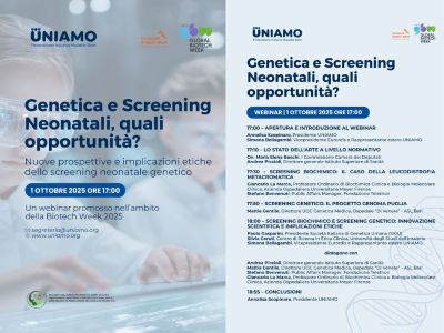 1 ottobre 2025 onlineBiotech Week: Genetica e Screening Neonatali, quali opportunità?Screening neonatale genetico: una nuova frontiera che può cambiare la vita di tanti bambini e famiglie. Ma insieme alle opportunità emergono anche domande importanti |