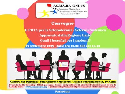 29 settembre 2025 Camera dei Deputati - Sala Giacomo Matteotti Piazza del Parlamento, 19 - RomaIl PDTA per la Sclerodermia - Sclerosi Sistemica approvato dalla Regione Lazio. Quali i benefici per i pazienti?As.Ma.Ra Onlus propone un incontro per celebrare un obiettivo promosso un anno fa e finalmente raggiunto: il PDTA della Sclerodermia – Sclerosi Sistemica |